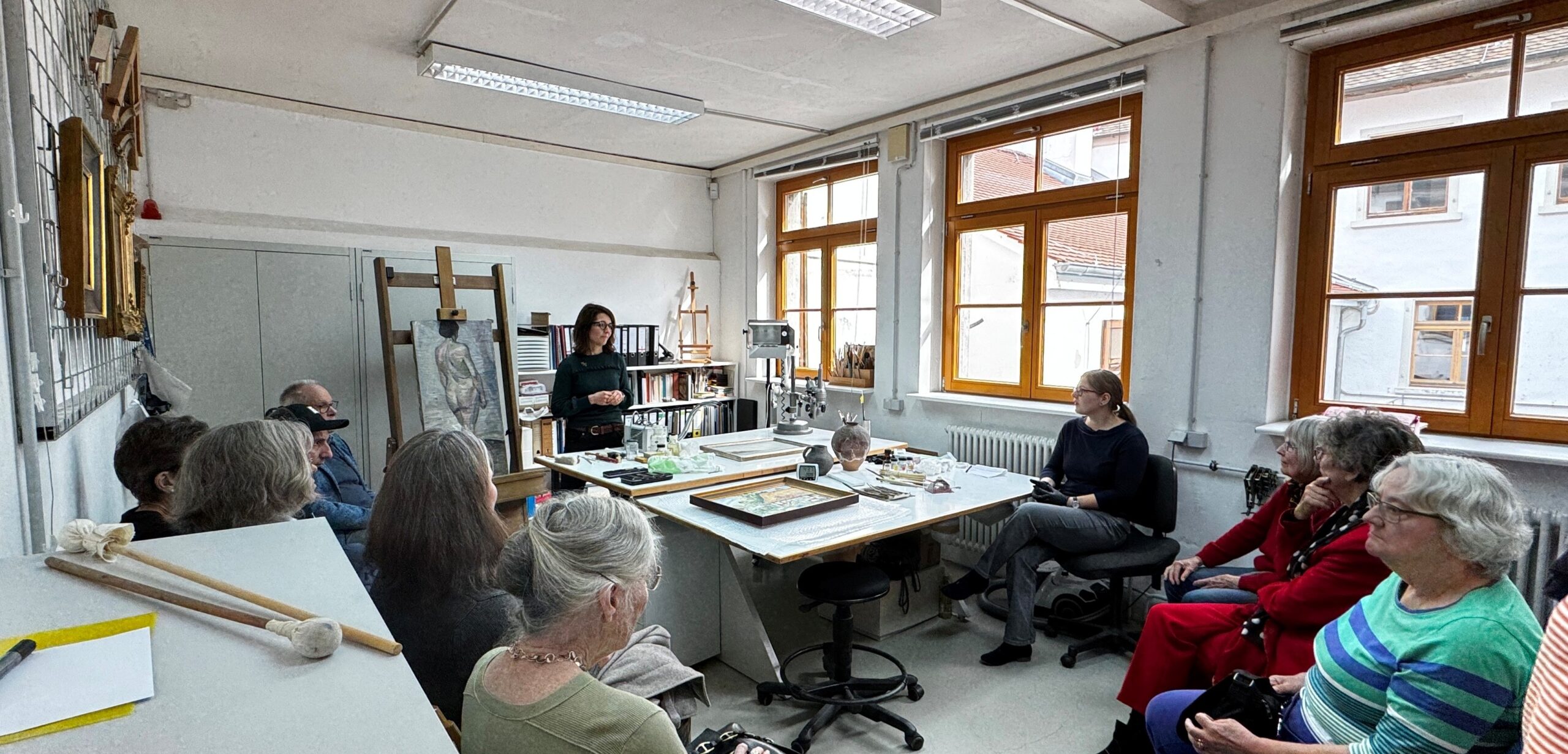 Die Diplom-Restauratorinnen Daniela Kocheise und Beatrice Kraft-Maier (v. l.) erklärten im Atelier der Städtischen Museen Konstanz anschaulich, wie Kunstwerke und historische Objekte fachgerecht bewahrt und für kommende Generationen erhalten werden. Alle Führungen waren ausgebucht – zahlreiche Besucherinnen und Besucher nutzten die Gelegenheit, einen seltenen Einblick in die vielfältigen Tätigkeiten und Aufgaben der Restauratorinnen zu erhalten.