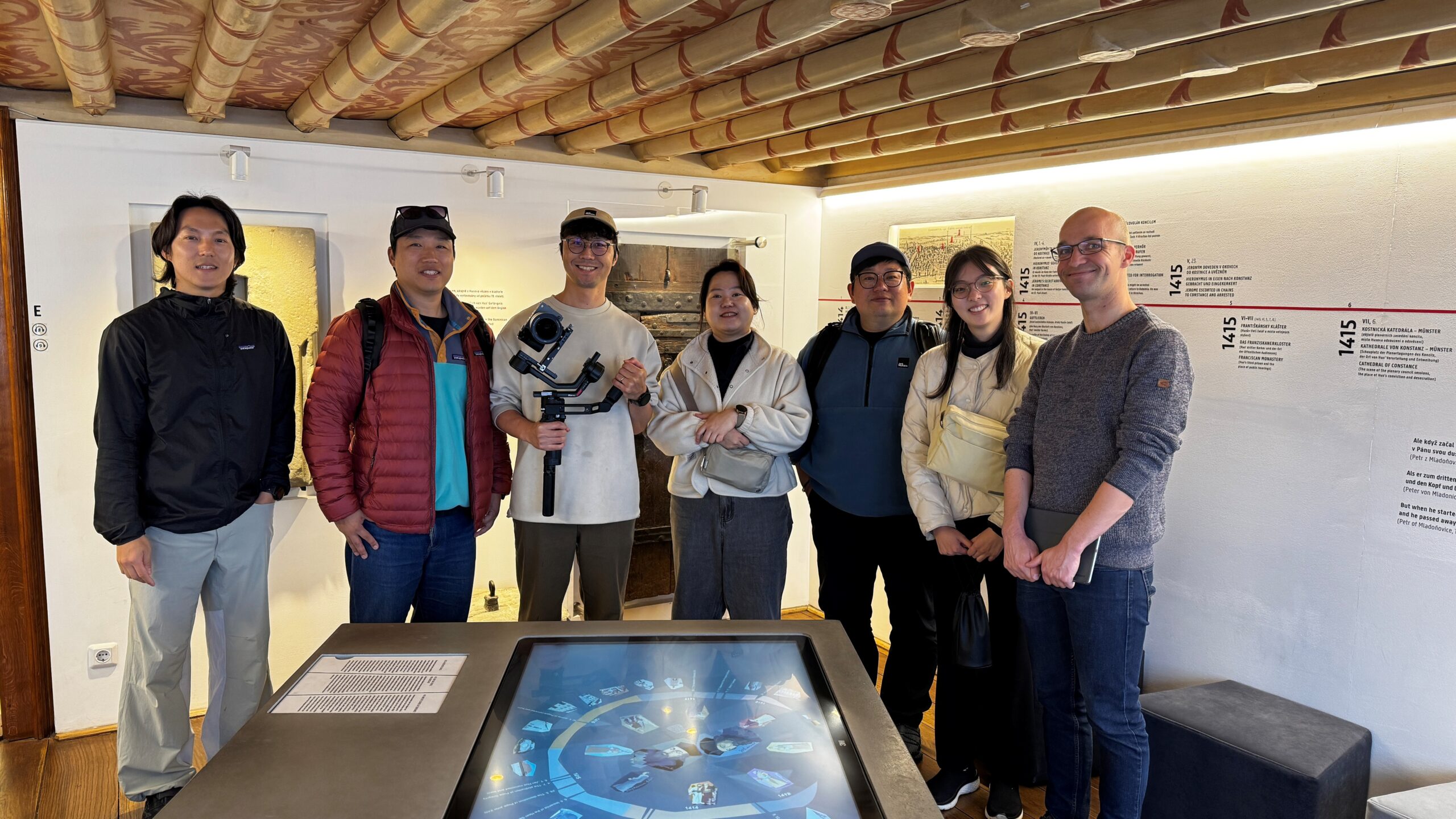 Anfang November besuchte eine koreanische Filmcrew der Streaming-Plattform Christian Global Network (CGN) das Hus-Haus in Konstanz für Dreharbeiten. Das Team arbeitet derzeit an der Dokumentationsreihe „Providence: That Time. That History. That Plan.“, die in fünf Episoden eine Globalgeschichte des Christentums von der Zeit des Todes Jesu Christi bis zum Beginn des 20. Jahrhunderts erzählt. Für das Projekt bereist die Crew 15 Länder auf mehreren Kontinenten und macht in insgesamt 40 Städten Station – darunter auch Konstanz. „Wir betrachten das Hus-Haus als einen sehr bedeutungsvollen Ort und möchten dort Themen filmen, die mit Jan Hus verbunden sind“, erklärt Yujin Song (2. v. re.) aus der Abteilung Content Production den Besuch. „Ich freue mich über die internationale Strahlkraft des Hus-Hauses und danke meinen Kolleginnen der Städtischen Museen für ihre Unterstützung während der Dreharbeiten“, resümierte Kustos Alexander Pöschl (1. v. re.).
