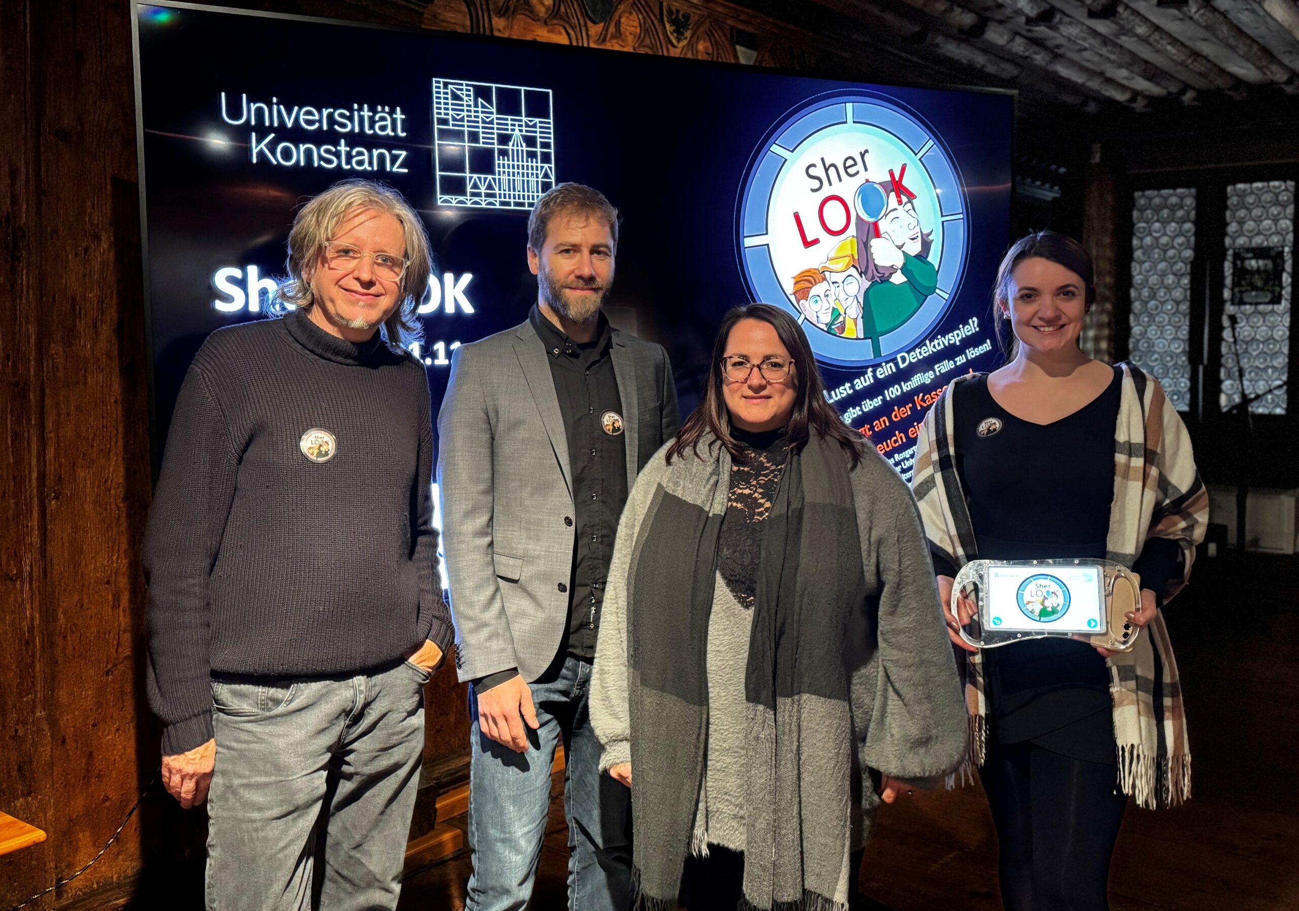 Zur Release Party des interaktiven Detektivspiels SherLOOK am 21. November hob Dr. Lisa Foege (2. v. rechts), Projektkoordinatorin des Museums, hervor: „SherLOOK steht für die innovative Kulturarbeit der Konstanzer Museen und zeigt, wie Museumsarbeit, Wissenschaft und digitale Kreativität harmonisch miteinander verknüpft werden können.“ Das strategische Spiel ermöglicht es, die Geschichte von Konstanz und die Museumsexponate auf eine neue, spannende Weise zu erleben. Die Veranstaltung war ein voller Erfolg und setzte einen neuen Akzent in der digitalen Kulturvermittlung. Auf dem Bild von links: Prof. Dr. Steffen Bogen, Kunstwissenschaftler und Gamedesigner, Marcel Indlekofer, wiss. Werkstätten Uni Konstanz, Dr. Lisa Foege, Stv. Museumsdirektorin und Johanna Platt, wiss. Hilfskraft.