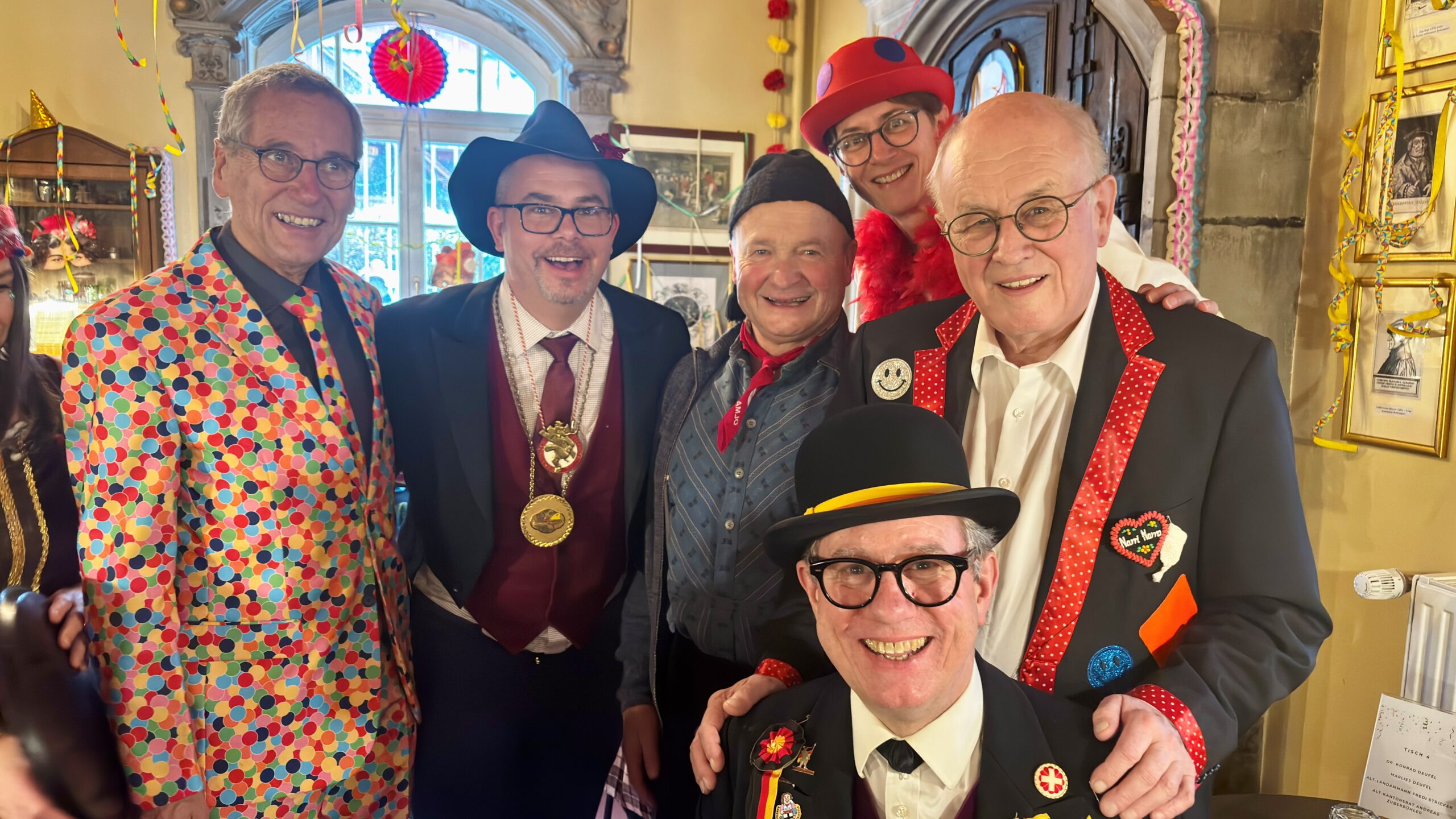 Ostschweizer Besuch auf der Konstanzer Fasnacht: Die Appenzeller Alt-Landammänner Roland Inauen (li.) und Alfred Stricker (3.v.li.) besuchten mit dem Thurgauer Finanzminister Urs Martin (mit Hut), Alt-Regierungsrätin Monika Knill und dem früheren Fraktionschef der CDU/CSU im Deutschen Bundestag, Volker Kauder, den traditionellen Narrenempfang im Rosgartenmuseum bei Museumschef Tobias Engelsing (vorne).