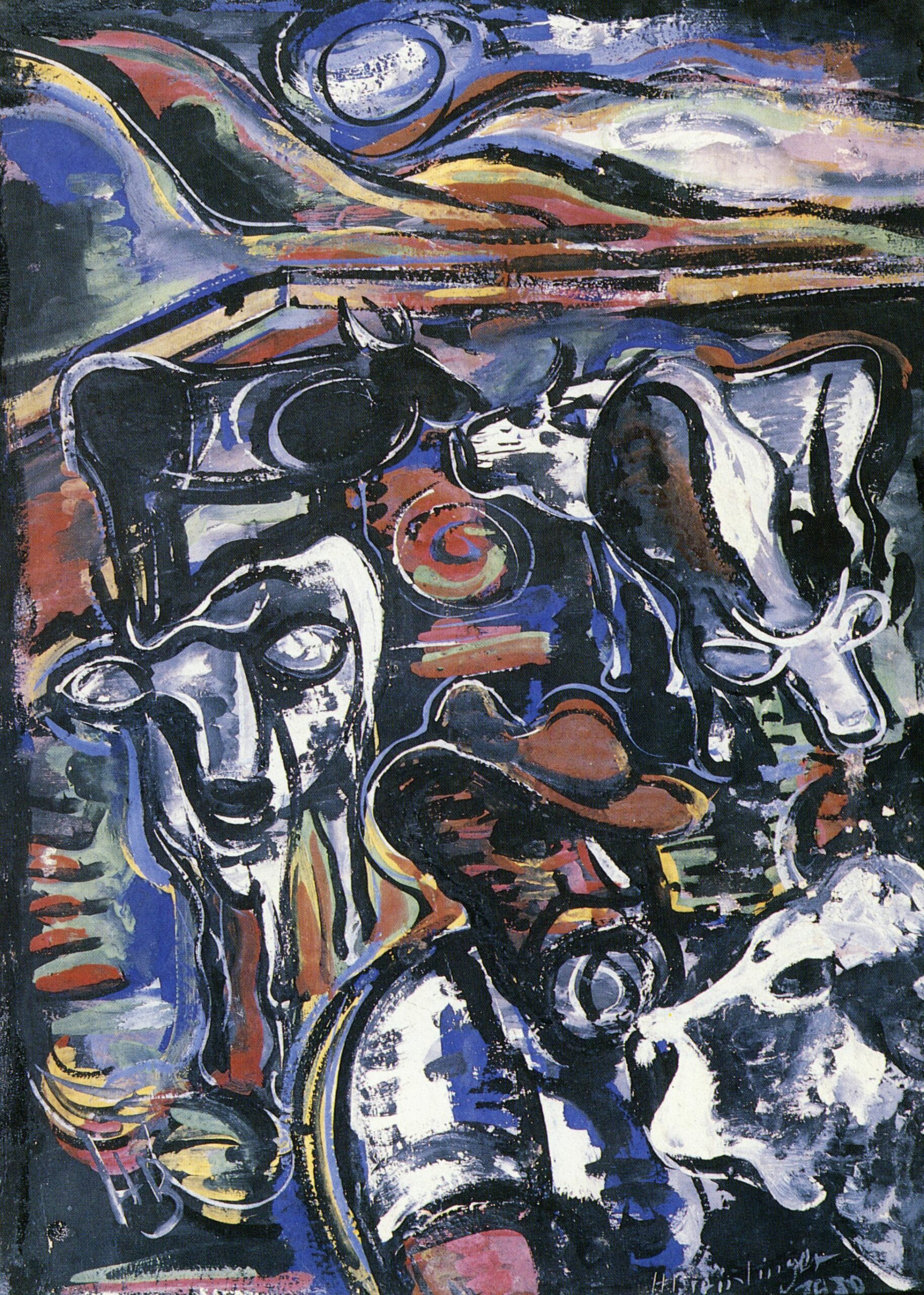 Hans Breinlinger: „Bauer mit Kühen“, Tempera auf Papier, 1932, ©Städt. Wessenberg-Galerie