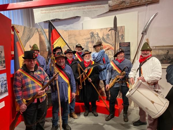 In der noch bis 7. Januar laufenden Sonderausstellung im Kulturzentrum am Münster („Jetzt machen wir Republik!“) versammelten sich die „Hecker-Leute“ um ihren Vorsitzenden Viktor Kaiser zum Gruppenbild mit der originalgetreu nachgebildeten Hecker-Figur, die dort ausgestellt ist.