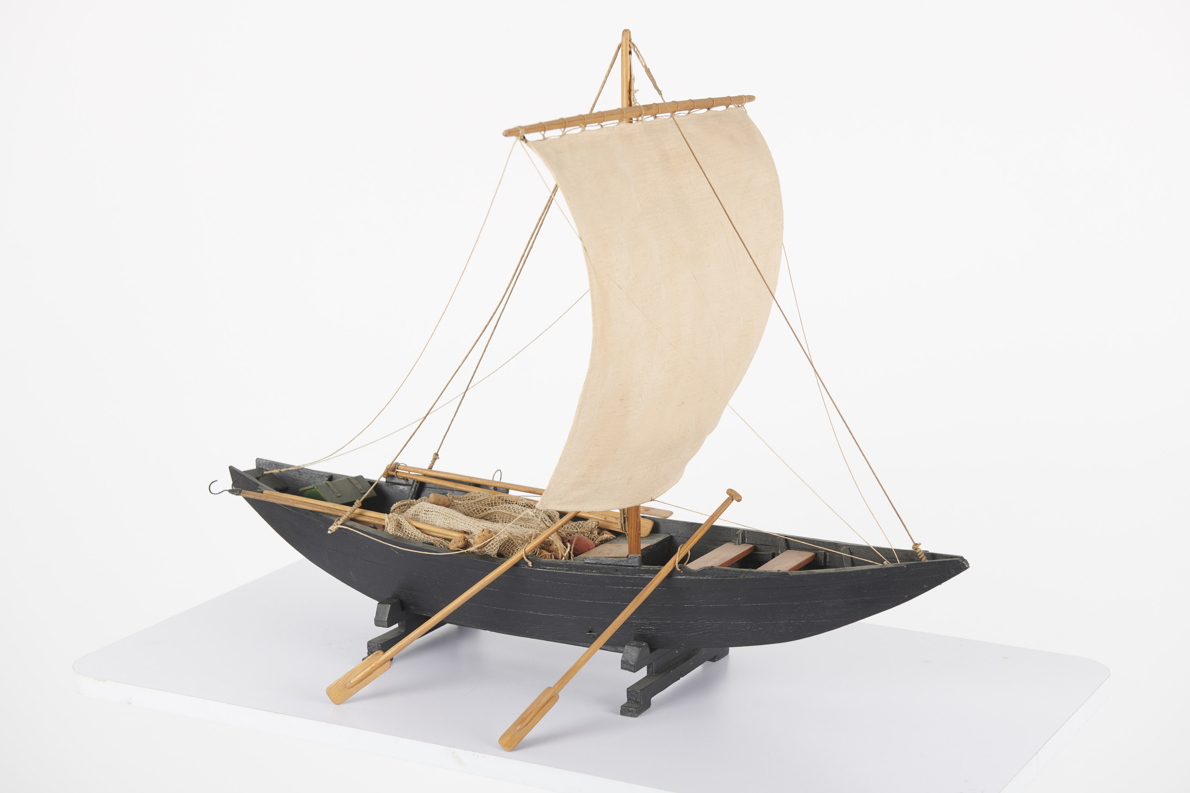 Modell einer Bodenseelädine mit ausgelegten Rudern und aufgezogenem Segel: Diese von bis zu 6 Männern gefahrenen Schiffe konnten bis zu 150 Fässer Wein laden. Die häufig überladenen Schiffe waren jedoch labil und kenterten in Stürmen leicht.