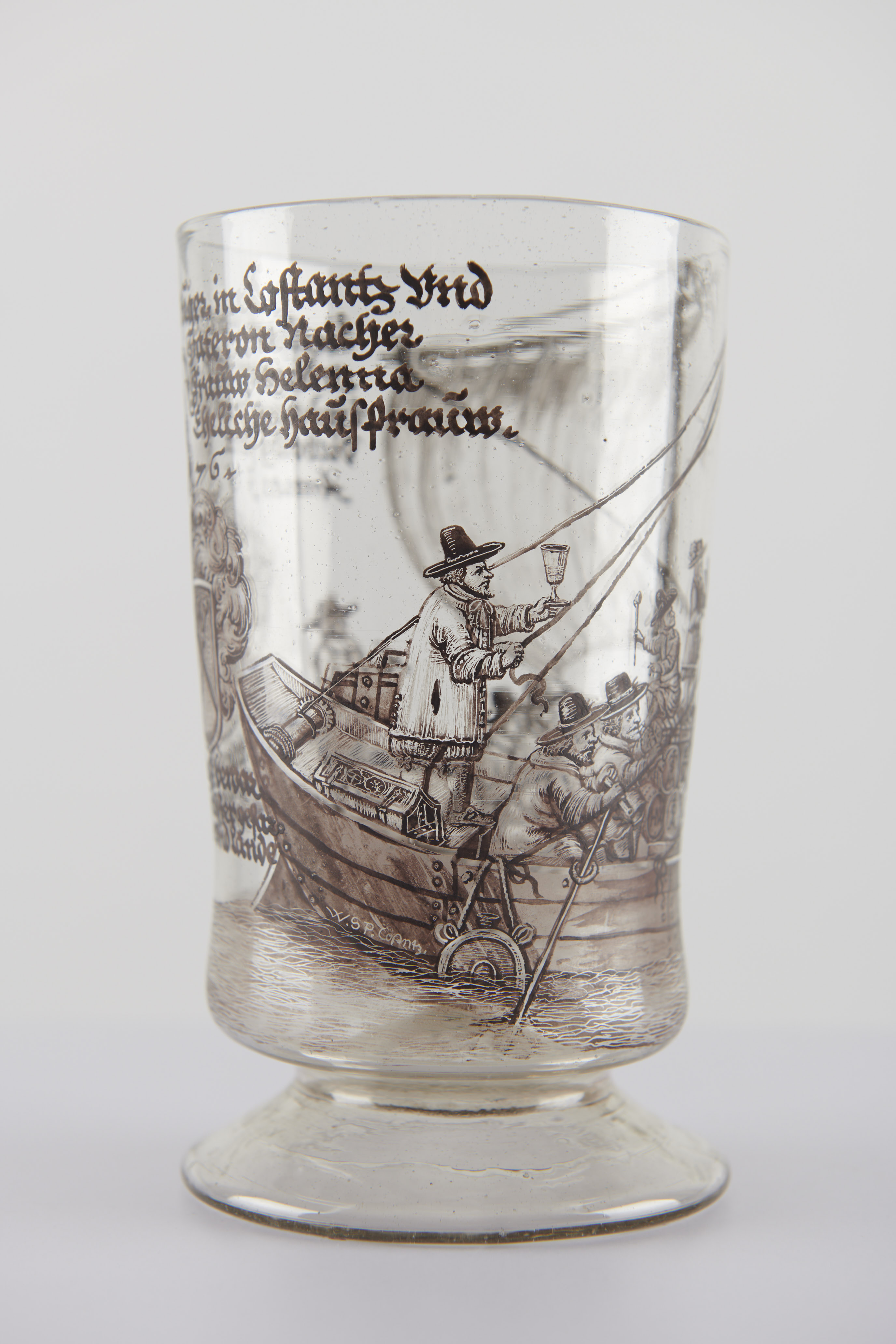 „Maria uns bewahr‘ in aller höchster Gefahr auf Wasser und Lande!“ Diese Bitte auf dem mit Schwarzlot bemalten Glaspokal der Konstanzer Eheleute Lienhard Spengler und Hellena Diebold von 1676 zeugt vom gefährlichen Arbeitsplatz auf einem Bodensee-Lastensegler. Der Schiffseigner Spengler reckt auf einer Lädine stehend den Pokal empor und bittet um Schutz für die Hochzeitsgesellschaft und seine Rudermannschaft.