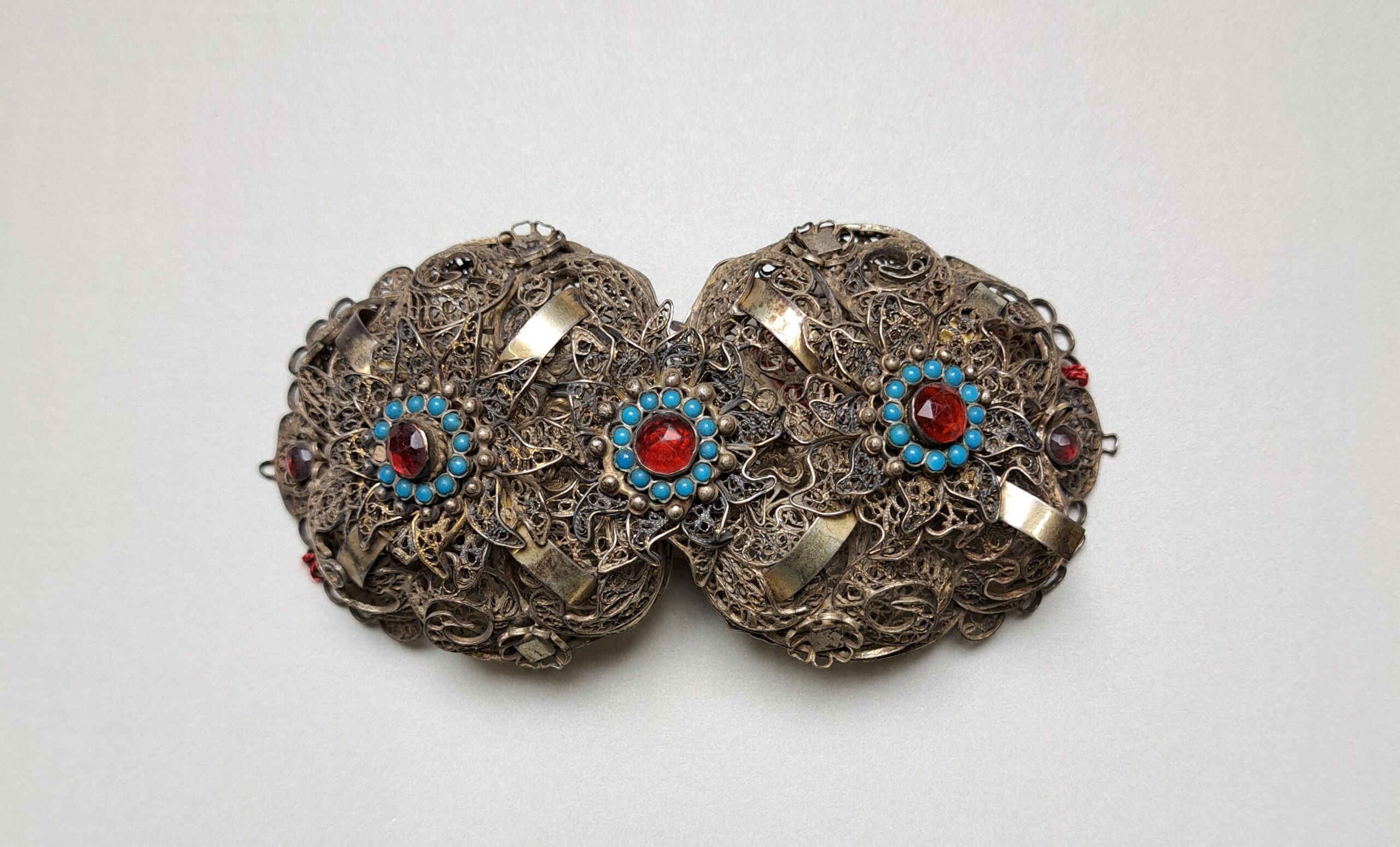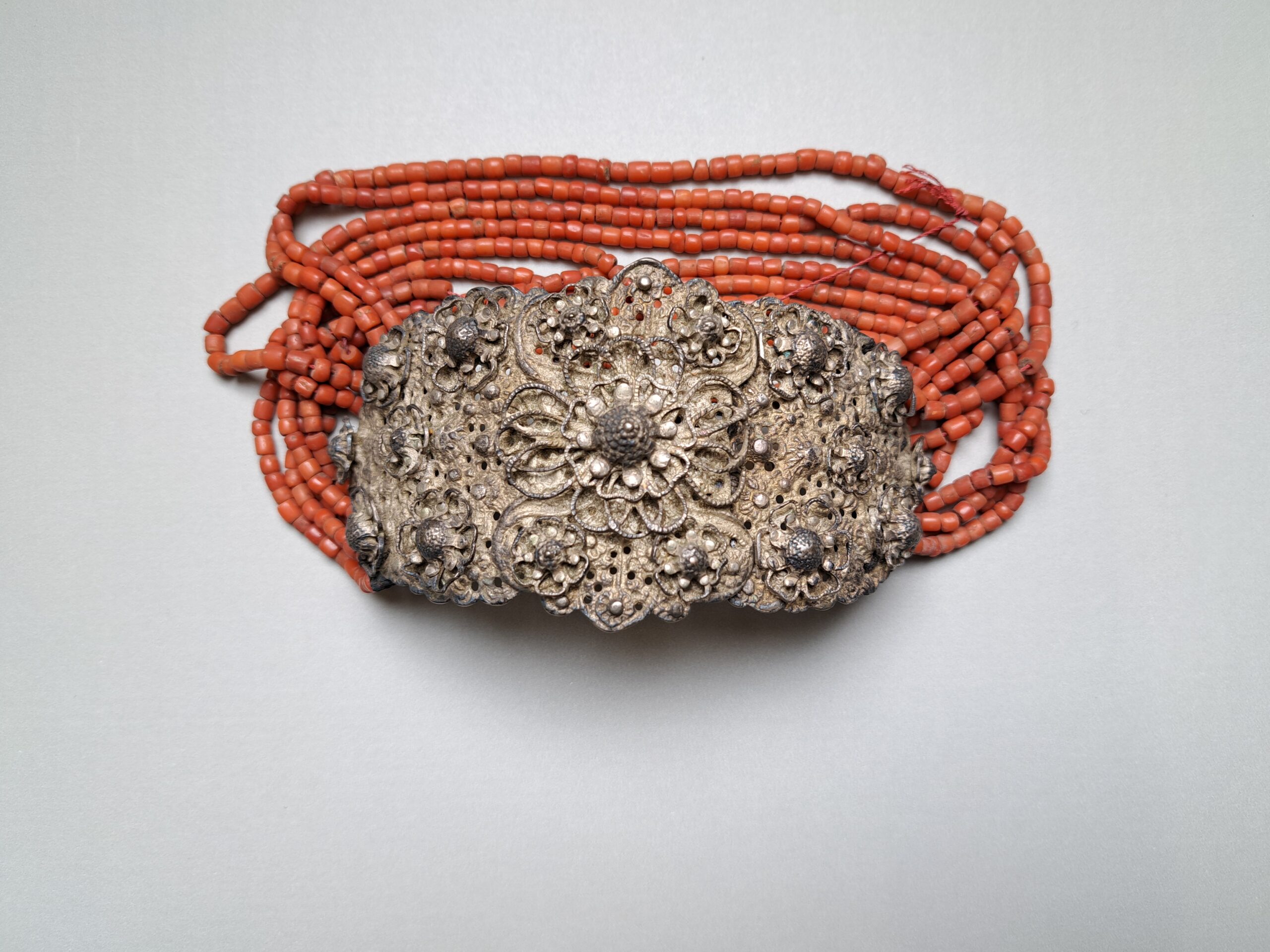 Silberfiligran mit roten Glassteinen und Silberperlen