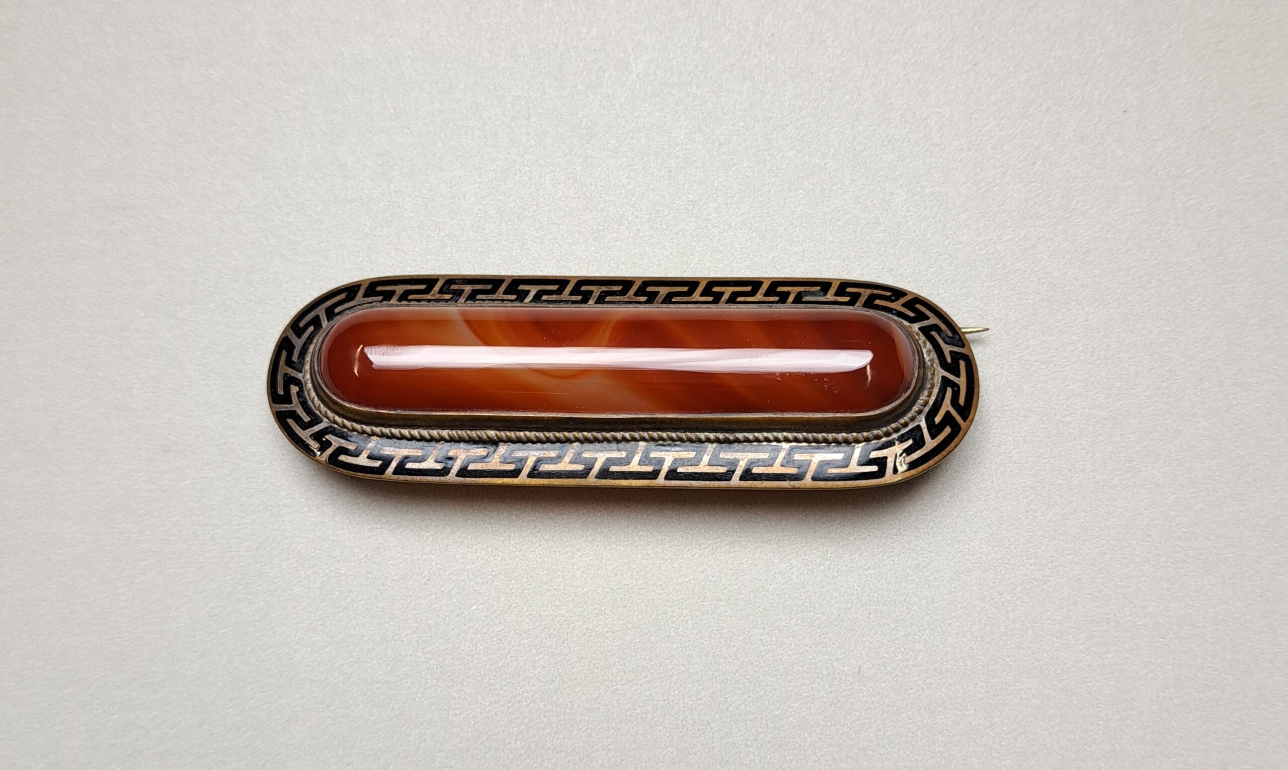 Länglicher, rotbrauner Stein (Achat?), eingefasst in silberfarbenem